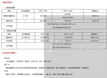 2、針對面紙掛漿量波動值大,無人關注其節約空間情況,精益生產管理咨詢召集攻關參與小組成員,劃分崗位,對生產設備或工序的關鍵控制點做有效的管控,并要求全體在方案上簽名后實施,并要求品管部每天召集相關人員對頭天品質異常進行分析改善,并及時填寫品質看板。