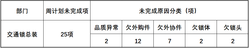②各車(chē)間生產(chǎn)不配套,7月份第2周交通鎖總裝欠料次數(shù)達(dá)25項(xiàng)、門(mén)鎖總裝欠料次數(shù)達(dá)